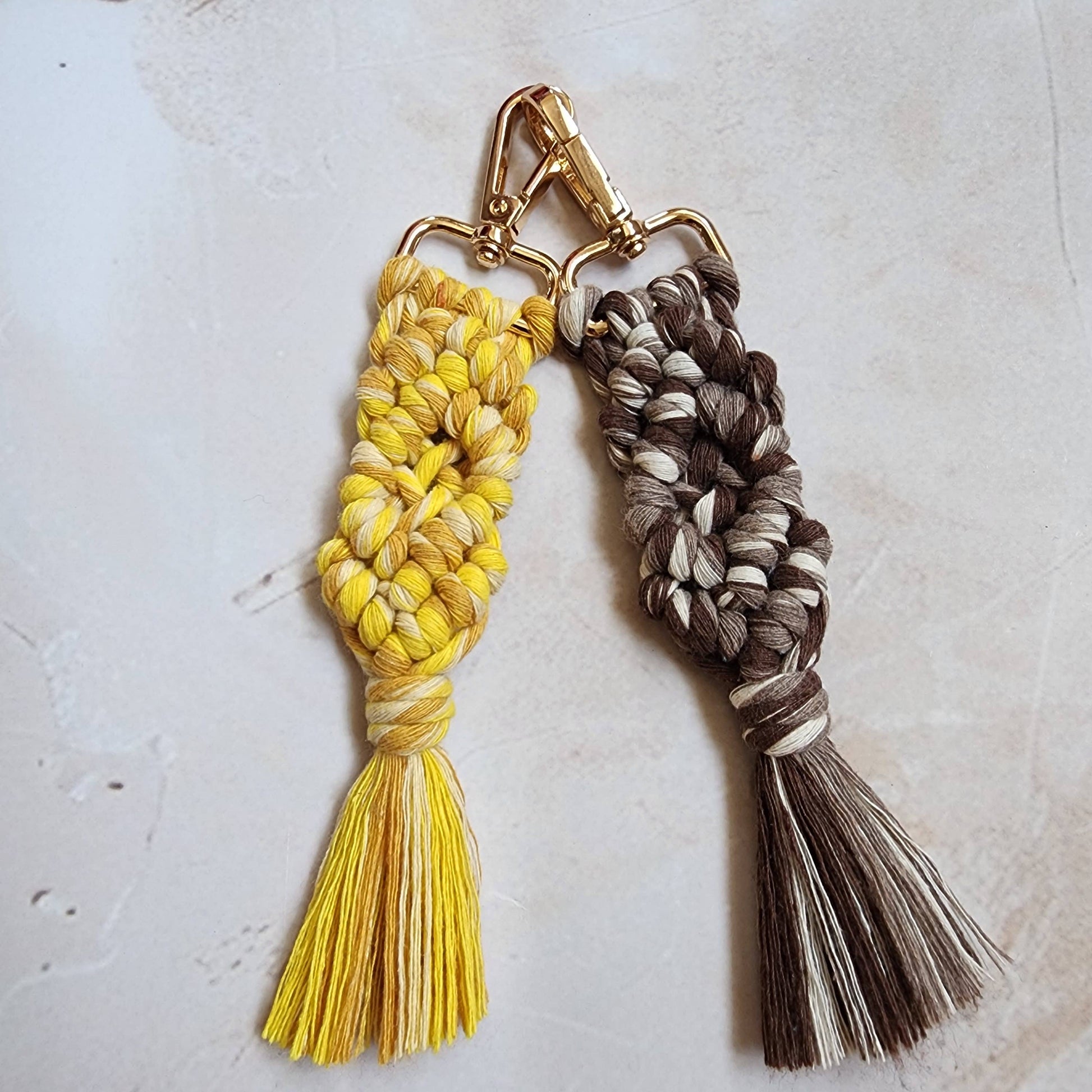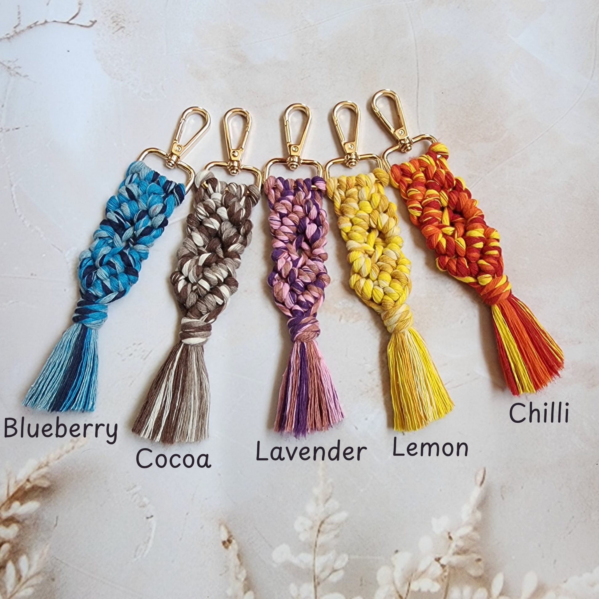 Add a stylish twist to your daily essentials with our handwoven macrame keychains. Featuring a thick braided pattern and soft cotton tassel, each keychain is secured with a polished gold clasp and finished in bold, fruit-inspired colors. Whether clipped to your keys, bags, or pouches, this charming accessory brings a pop of personality and texture to any look.