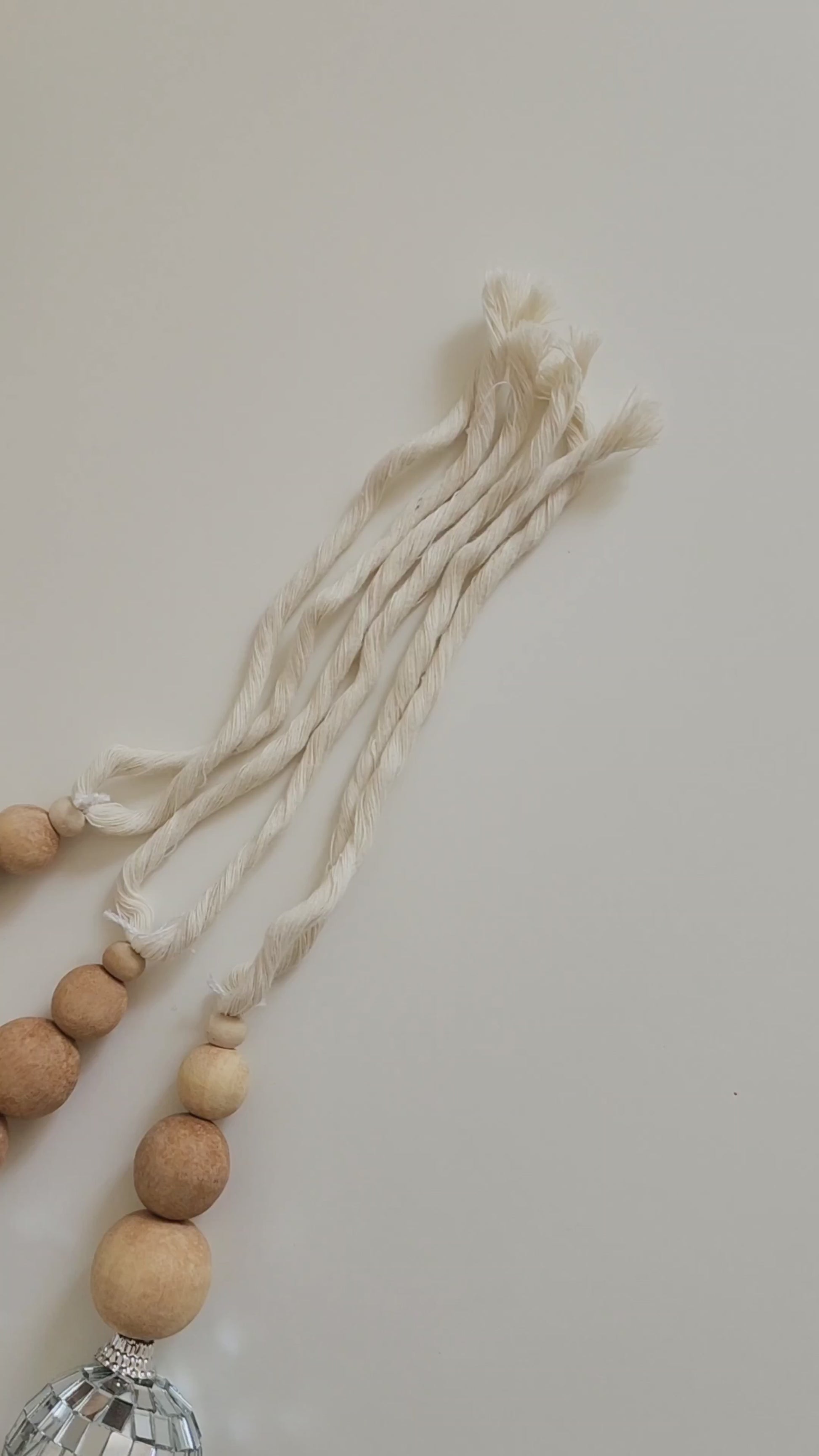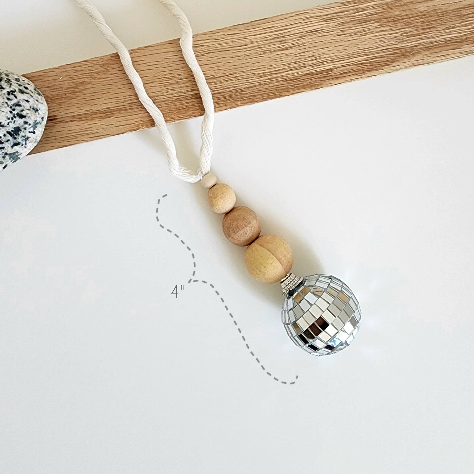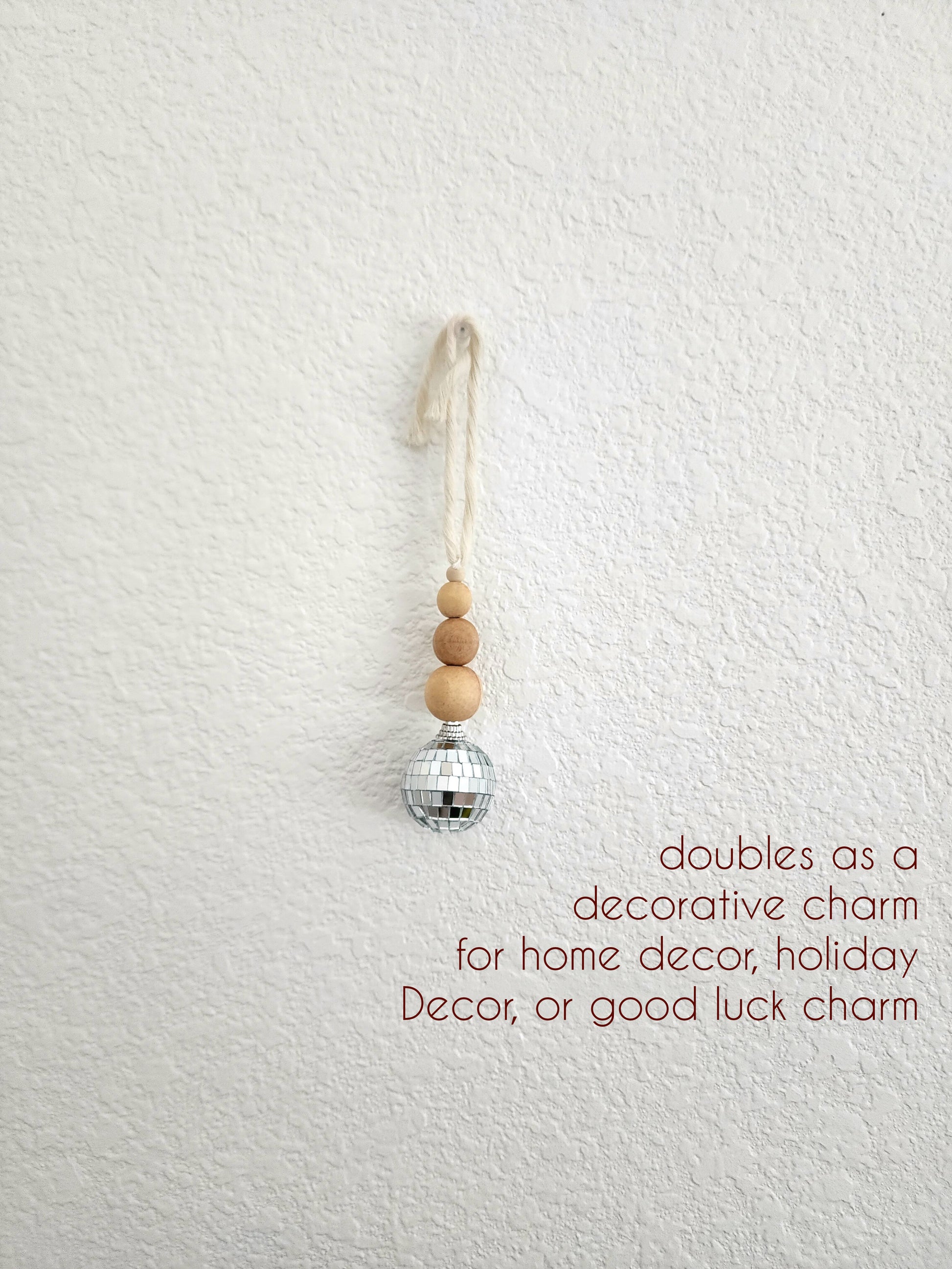 - Elevate Your Commute: Enhance your drive with this macramé car charm featuring a disco ball and wooden beads as an oil diffuser.