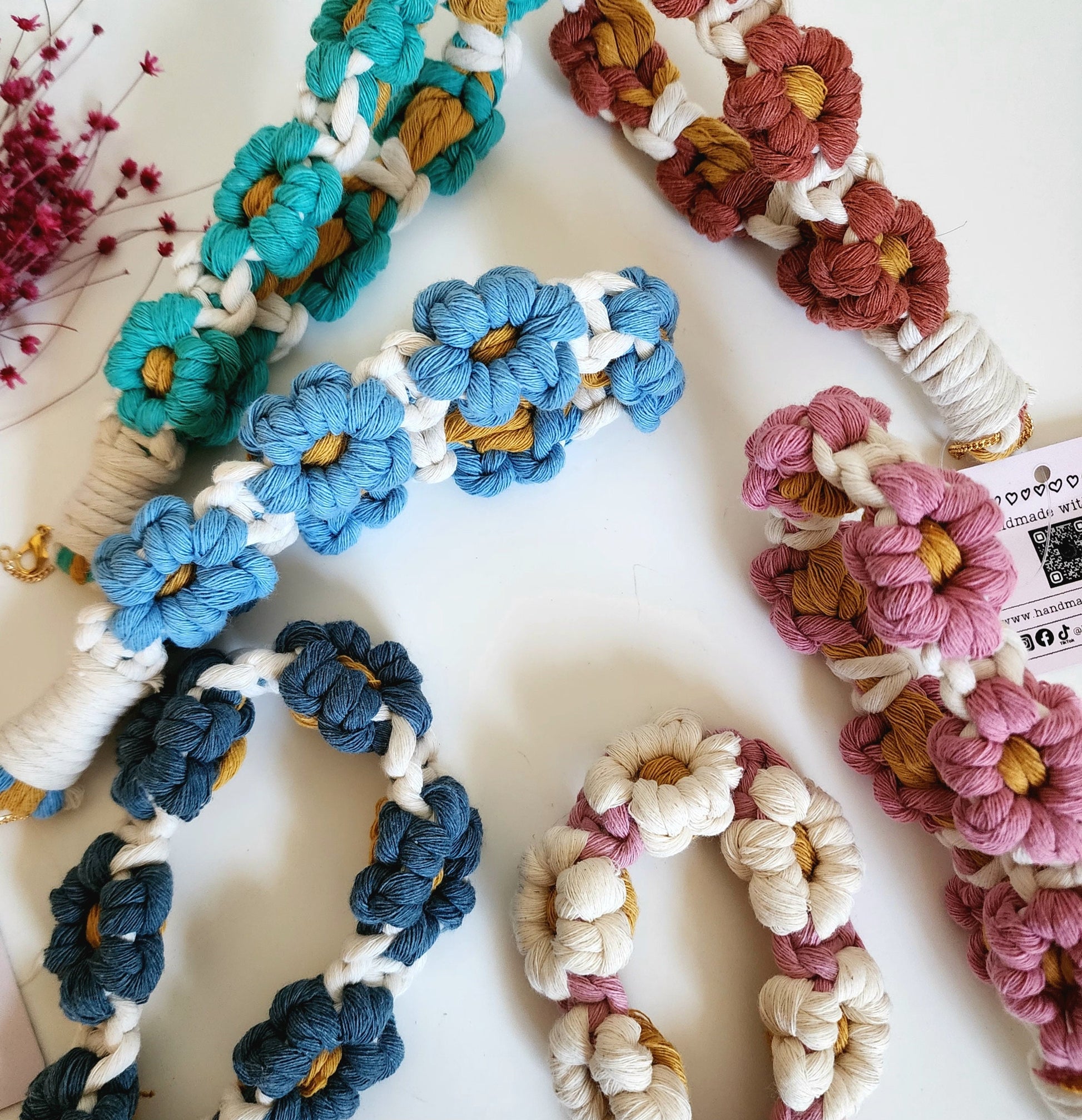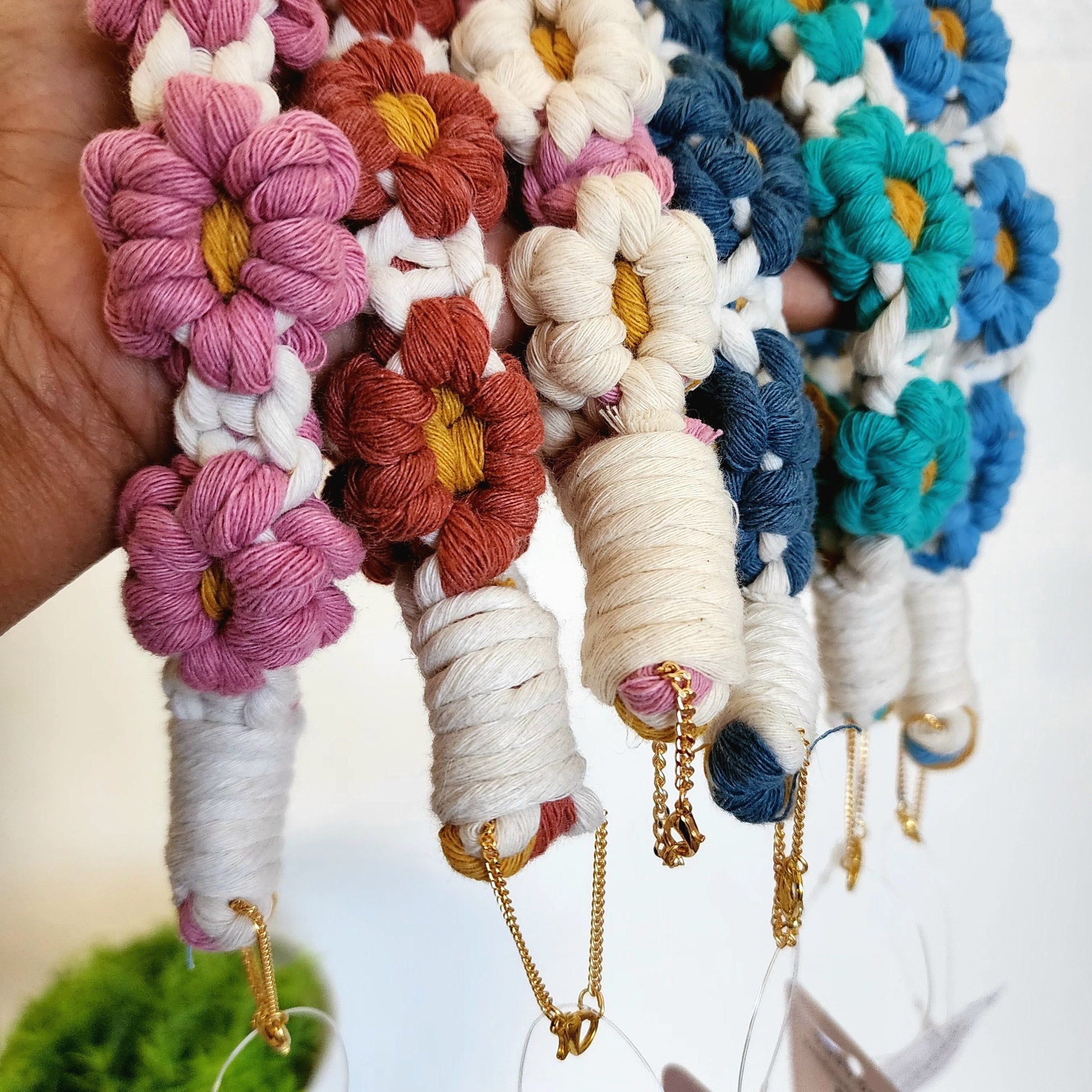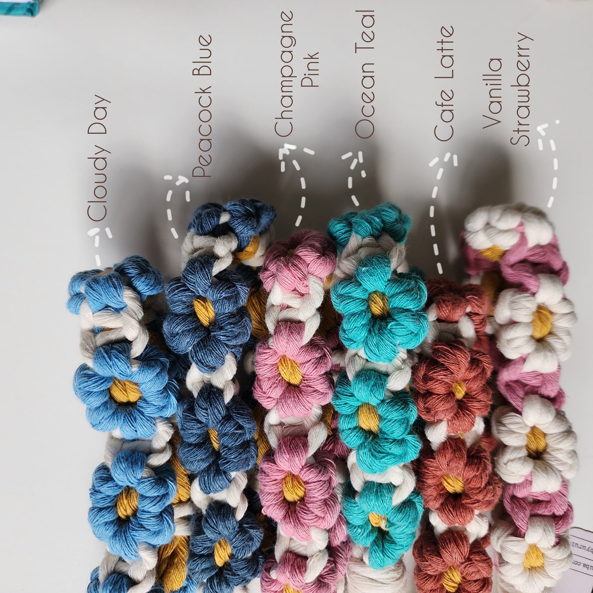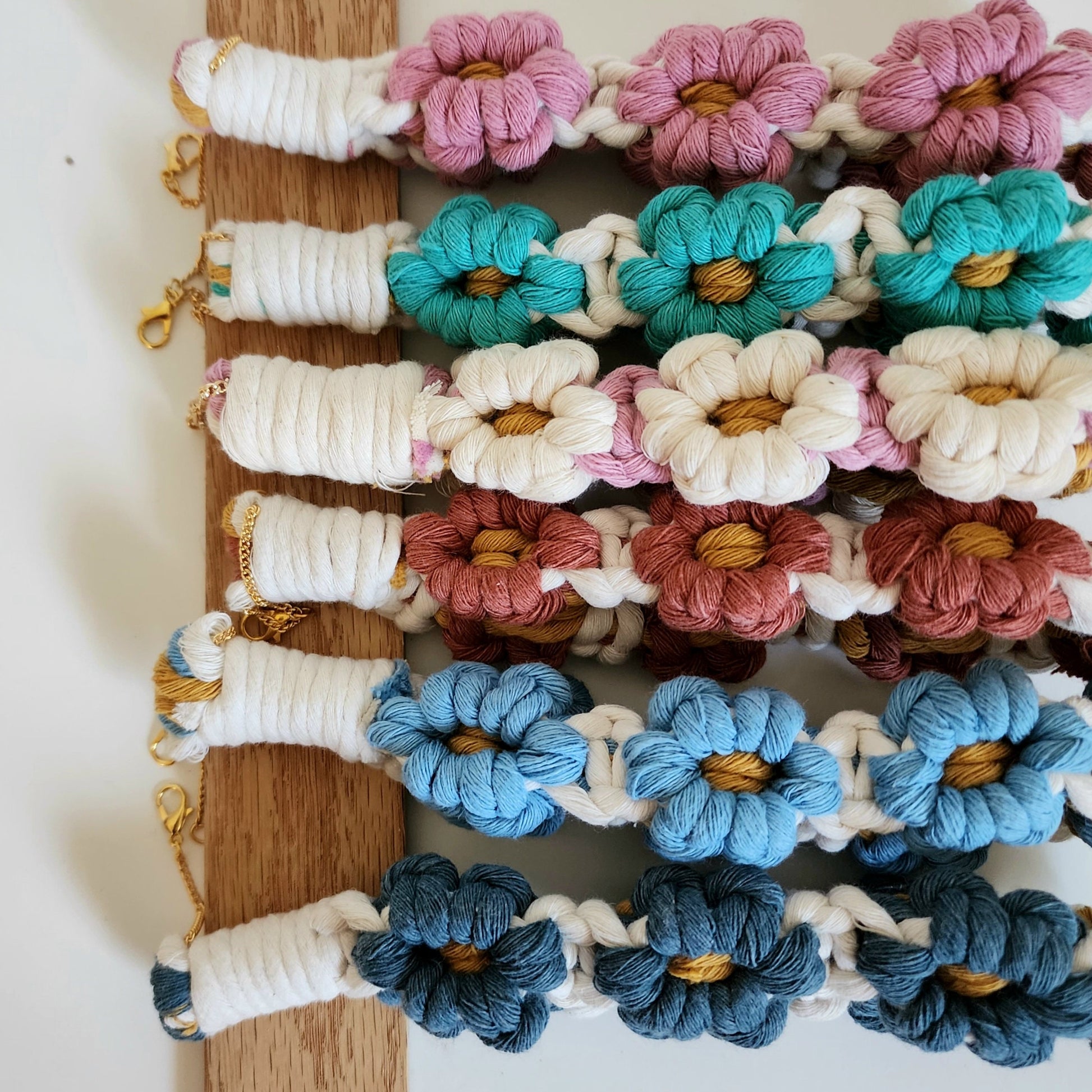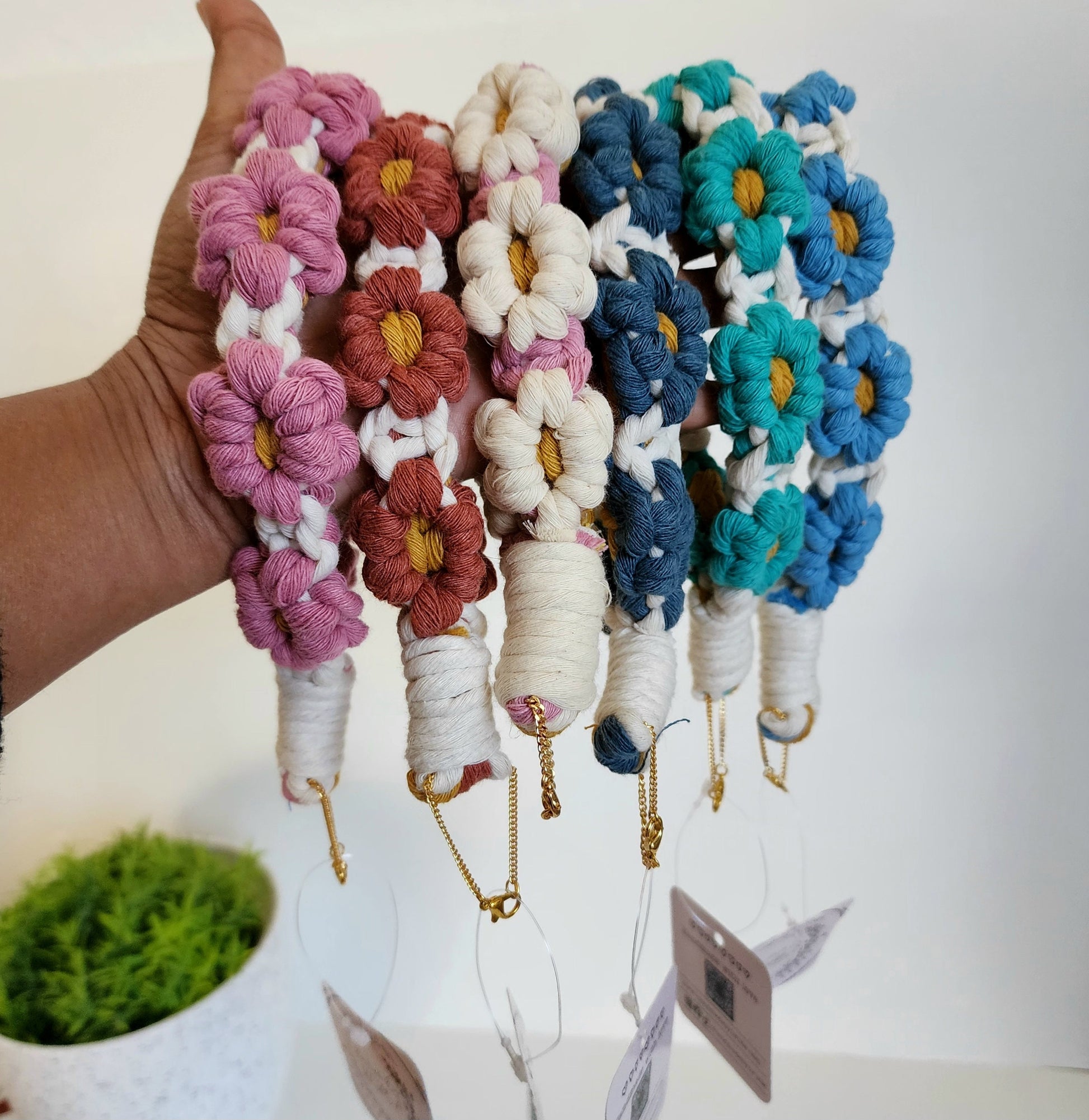 Each wristlet features an intricately handcrafted daisy flower made from soft cotton macrame, capturing the essence of nature‘s beauty. The delicate petals and detailed design make it a unique and eye-catching accessory.