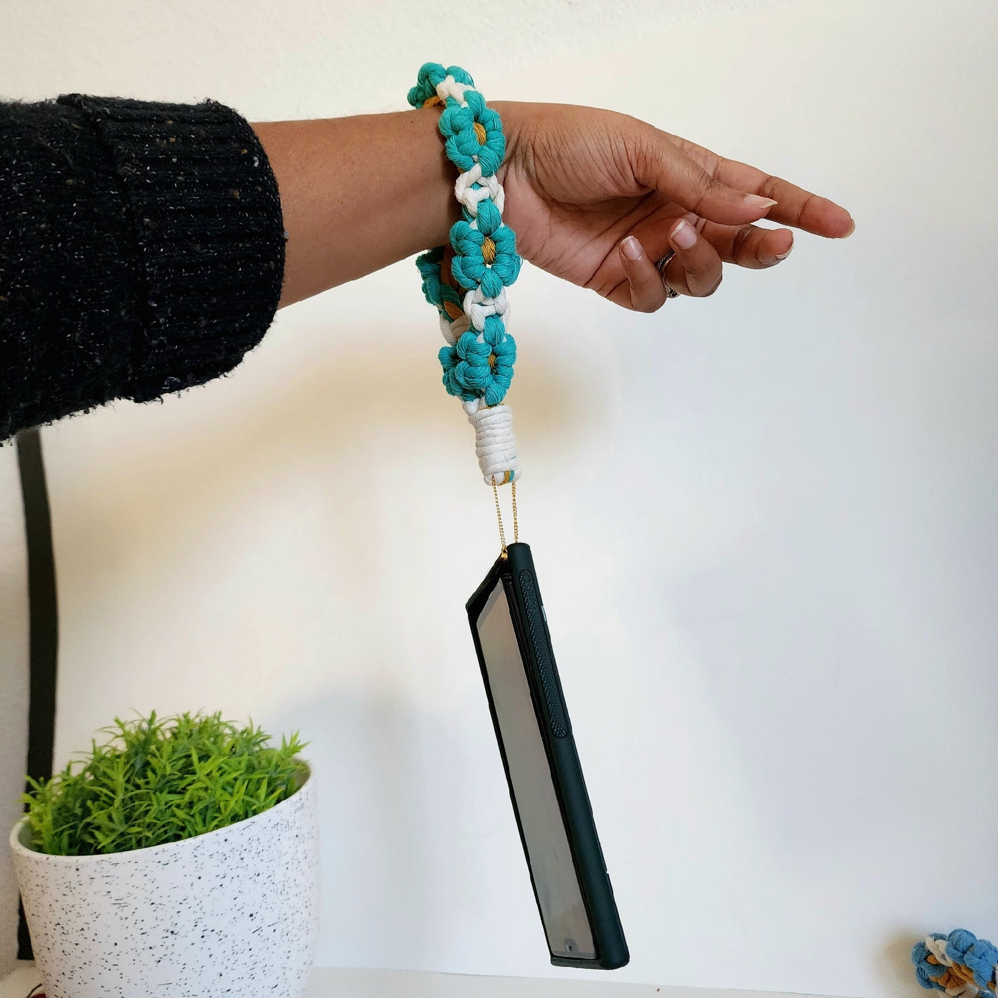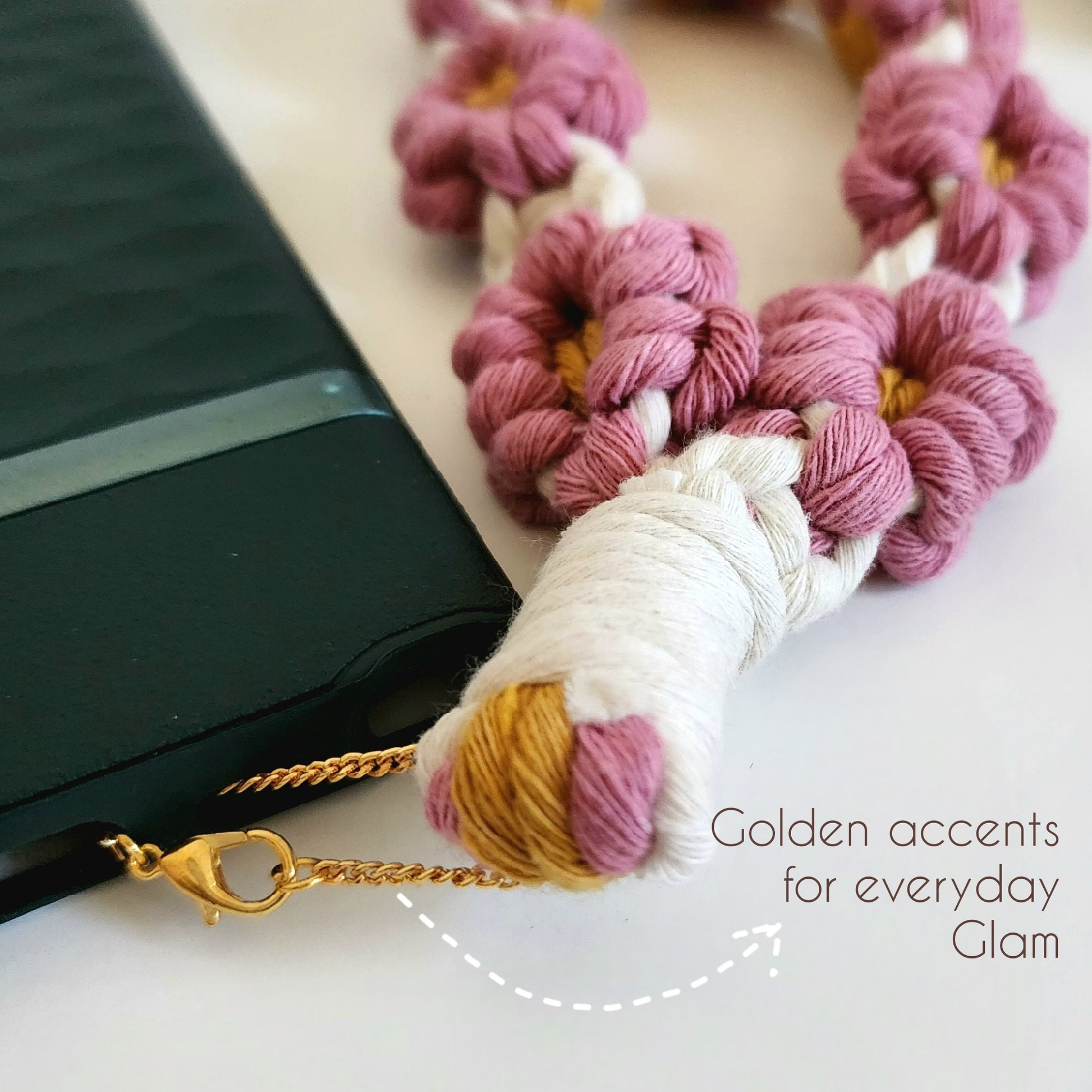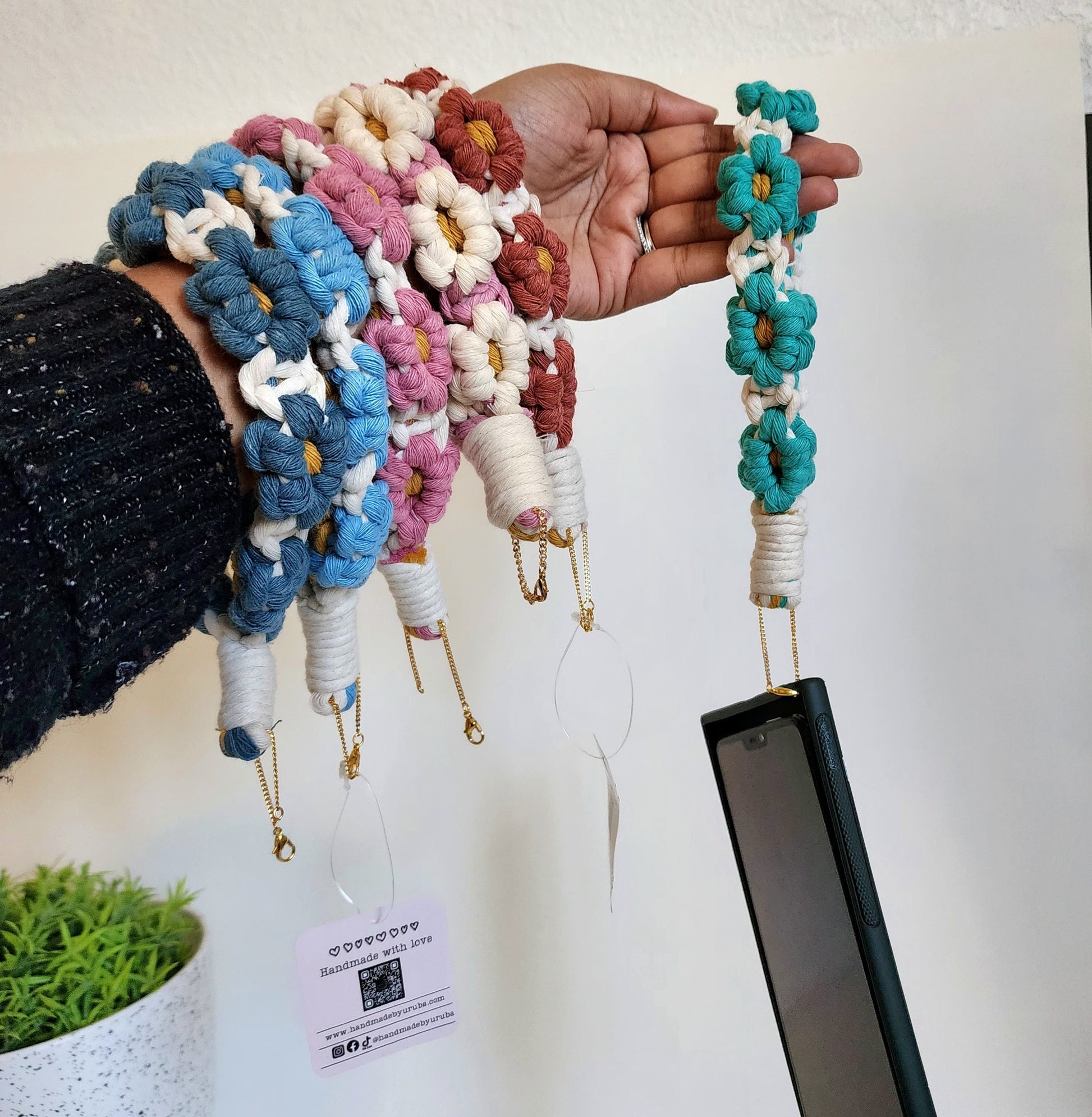 Add a touch of whimsy and functionality to your daily adventures with our Handmade Cotton Macrame Daisy Flower Phone Holder Wristlet. Its intricate design, vibrant colors, and elegant gold chain make it a must-have accessory for fashion-forward individuals who appreciate the beauty of handmade craftsmanship.