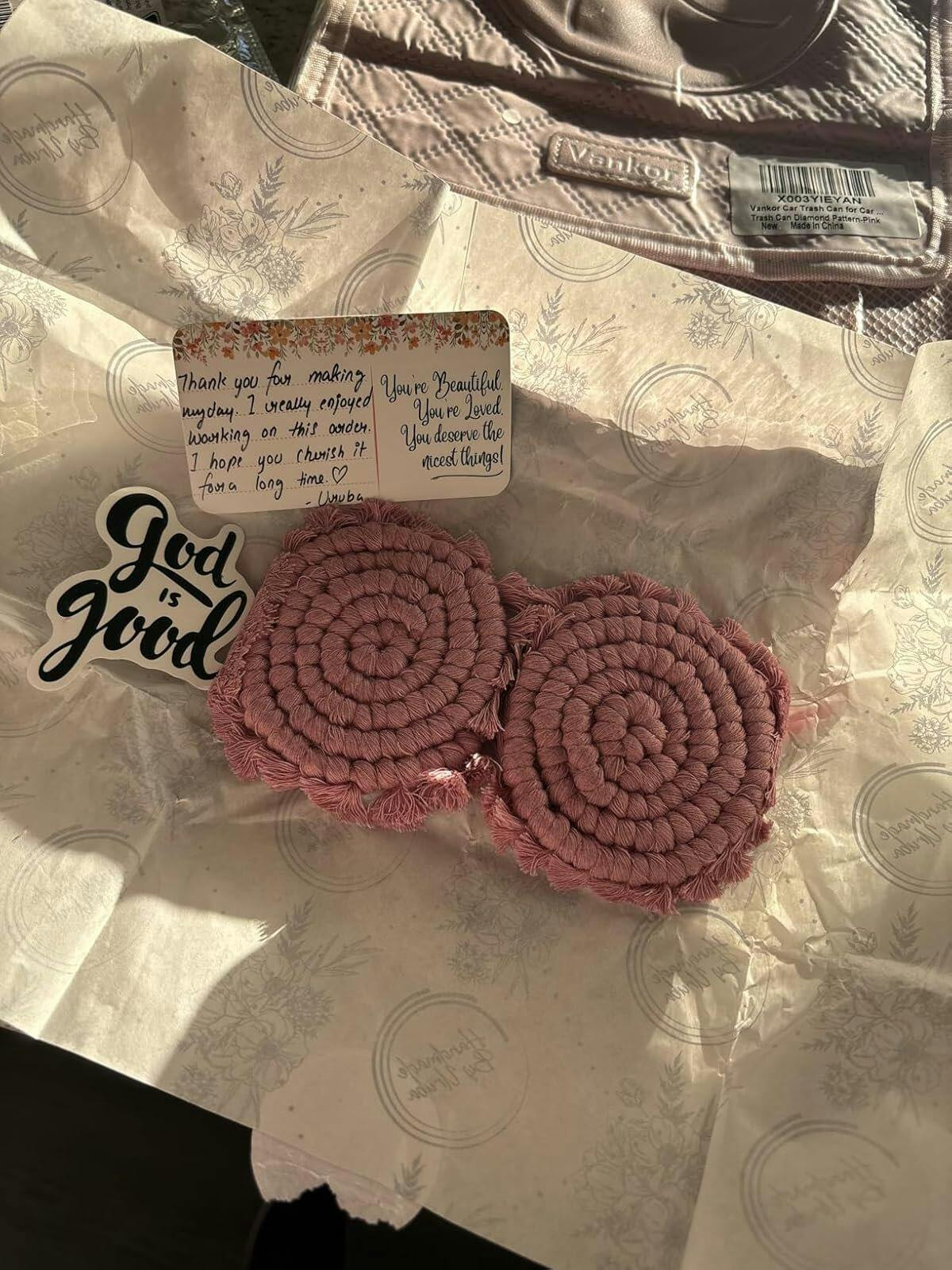 - Handmade Boho Macrame Car Coaster Set: Elevate your car's interior with this stylish addition.